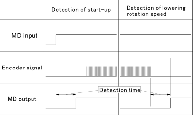 Motion detector function is to execute [Encoder start detection] and [Encoder Stop detection] by monitoring signals from the rotary encoder when input MD signal (actuation signal of press machine). Contents of detection are disconnecting of encoder cable, un-standard states of the timing belt or pulley and so on.