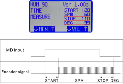 It calculates [Start delay time (ms)], [Rotation speed (SPM)], [Stop delay time (ms)] and [Angle (DEG)] by using MD input and signals of the rotary encoder.