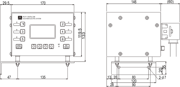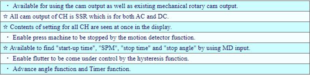 PS-711 digital cam with liquid crystal display is designed to compare signals from the rotary encoder installed to the rotating shaft of the press machine with the setting values and to output control signals conforming to the rotary cam.