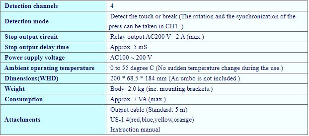 PS-104F is a malfunction detection device with four channels of the contact detection method for the press machine. The jack method is used for detection-input terminals of all channels in front of the panel.