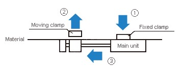 â‘¡ Moving clamp releases material, and