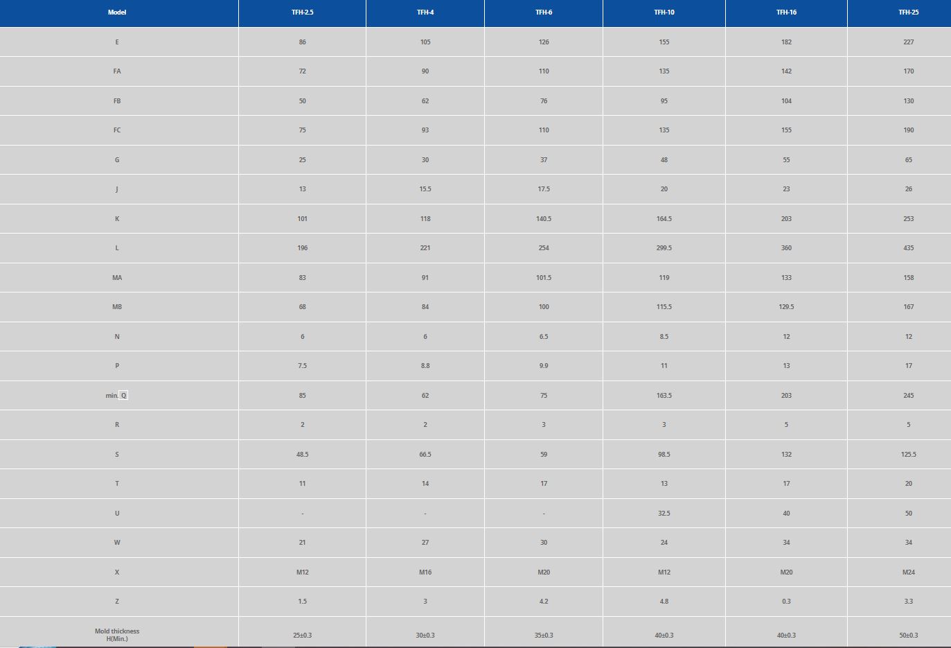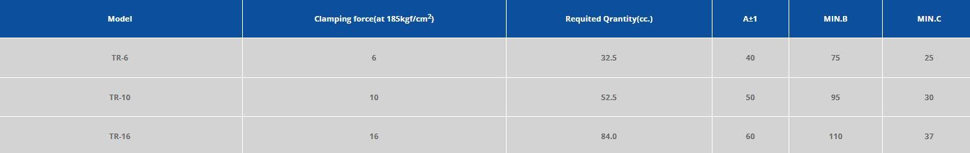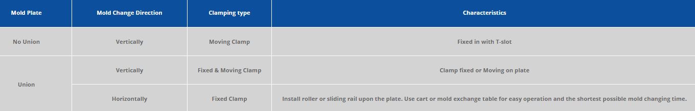 The following specifications can help you choose the appropriate clamp type in accordance with your injection molding requirements and production situation. Make sure of your production plans and production procedure before choosing your product to be sure of the product that best suits your needs.